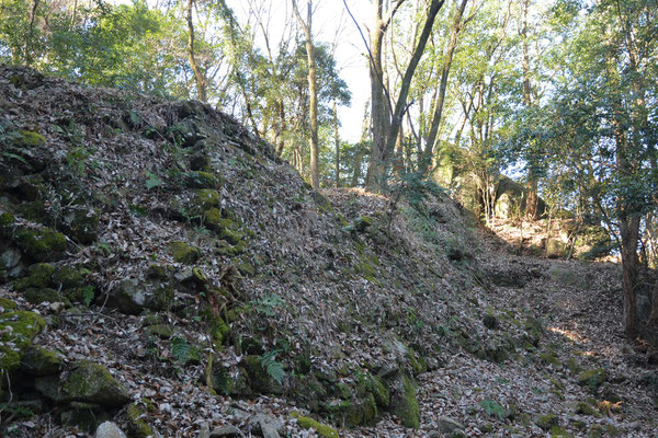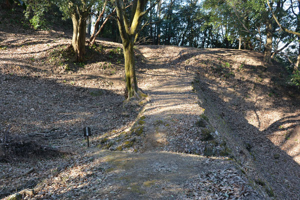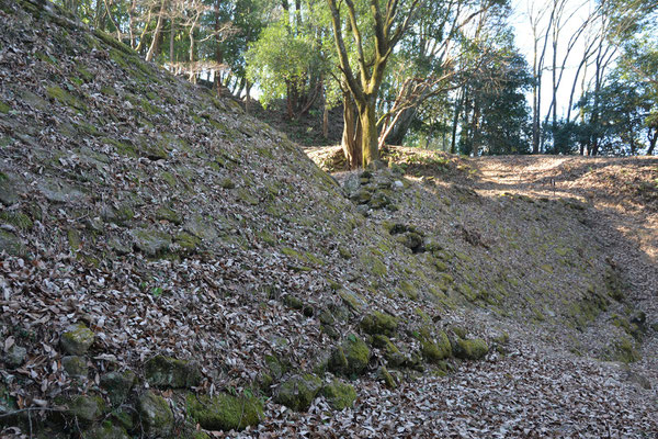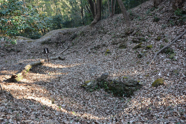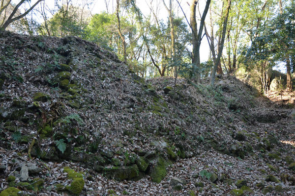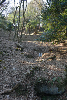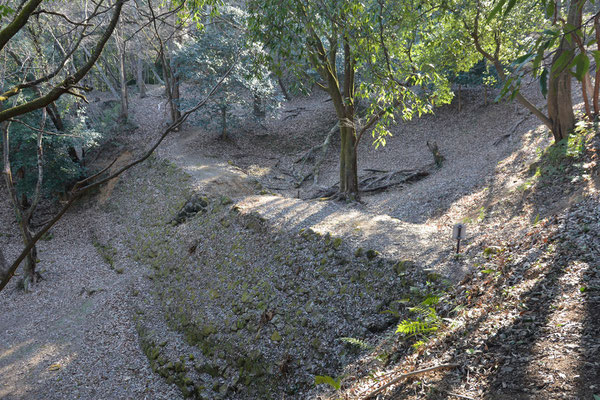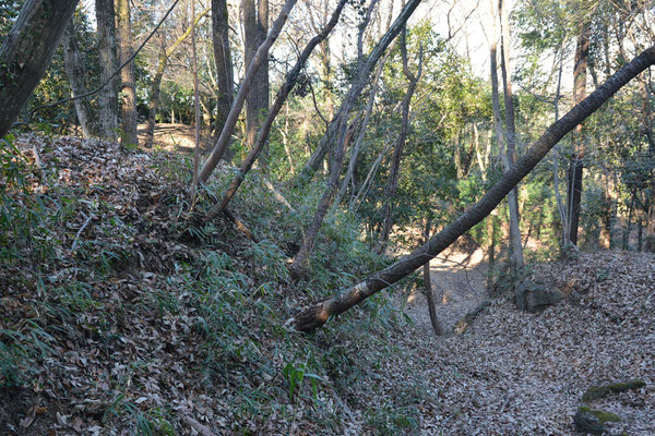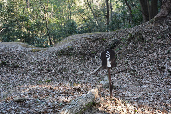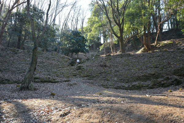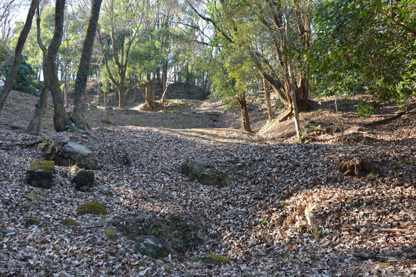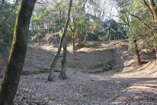 これは「谷筋を堤防などで複数に区切って2つの曲輪として構成し、それぞれの曲輪内を井戸水と雨水によって湛水させることで、水堀と水利、両方の役割を果たす」(Wikipedia)とありますが緩やかな斜面=攻城側有利を解消できることもあって一挙両得どころか「一挙三得」の効果を期待する施設だったと思われます。