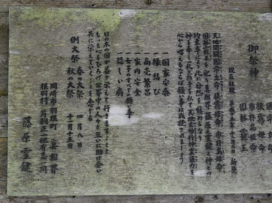 まずそちらの地名(場所はこちら)「長野県下伊那郡根羽村」ですが「根羽」。途中やはり「ネバーランド」(森の駅)なる看板を見てやはり「言葉遊びね」と思っていると、そちらの祠の掲示板に例大祭の協賛に岡崎市の「羽根」の名が見えてニヤリとさせられました。